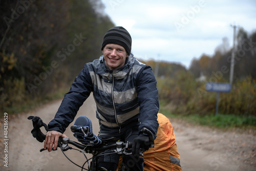 Fototapeta premium Russian bicyclist in the autumn forest, Moscow Region