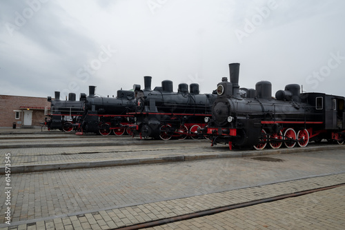 © евгений ставников, Fototapeta premium russian black retro train against a gloomy sky