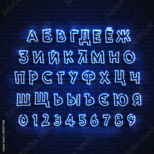 Fototapeta premium Russian neon font. Glowing alphabet, electric stand, against a brick wall...