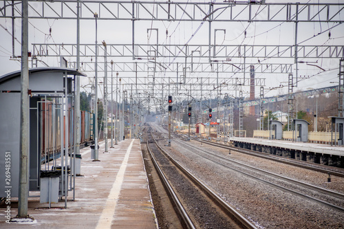 Fototapeta premium Russian railway. Rails sleepers contact network. Journey. Railway in the fall.