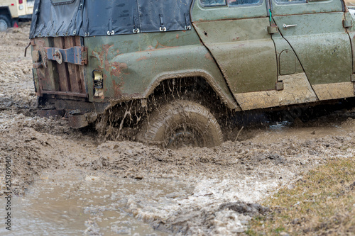 © Mountains Hunter, Fototapeta premium Russian SUV, Off-road vehicle slips, Stuck in the river
