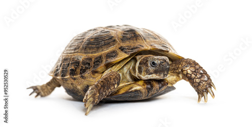 © Eric Isselée, Fototapeta premium Russian tortoise walking on a white background