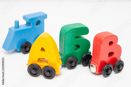 © FOTO_STOCKER, Fototapeta premium Russian wooden letters train alphabet with locomotive. Bright colors of red yellow green and blue on a white background. Early childhood education, learning to read, preschool and kids game concept.