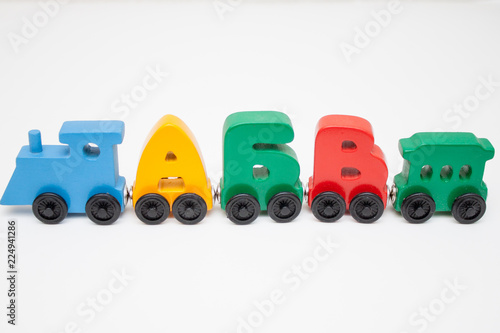 © FOTO_STOCKER, Fototapeta premium Russian wooden letters train alphabet with locomotive. Bright colors of red yellow green and blue on a white background. Early childhood education, learning to read, preschool and kids game concept.