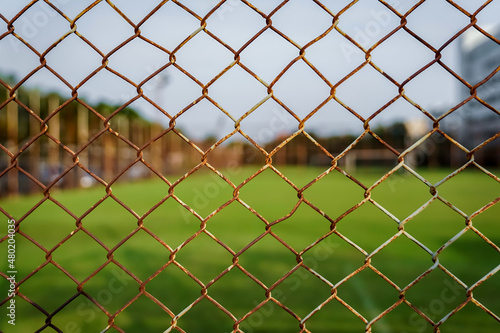 © Surachetsh, Fototapeta premium Rust steel net with blur football field.