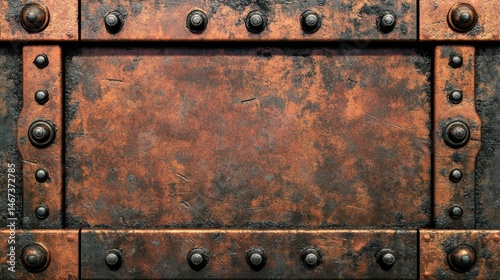 Fototapeta premium Rusted copper plate showcasing industrial decay with darkened edges and grunge details, reflecting a bygone era of craftsmanship and wear