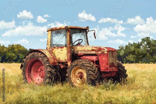 © talkative.studio, Obraz premium Rusted Farm Tractor Parked in a Field of Grass