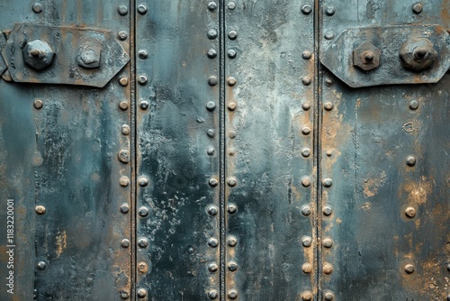 Fototapeta premium Rusted metal door, rivets, urban decay, textured background, industrial design
