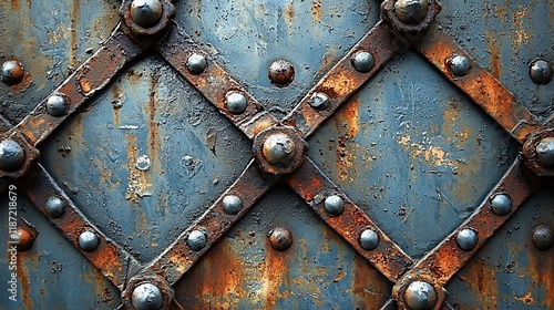 Fototapeta premium Rusted metal gate with cross pattern and rivets.