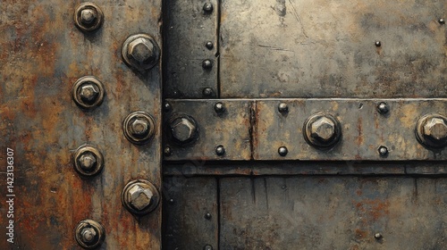 © gita, Fototapeta premium Rusted metal panel with rivets and bolts. Detailed close-up view of aged, textured, industrial metal.