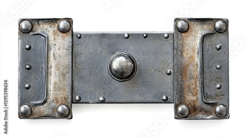 Fototapeta premium Rusted metal plate with rivets and handles, isolated on white background.