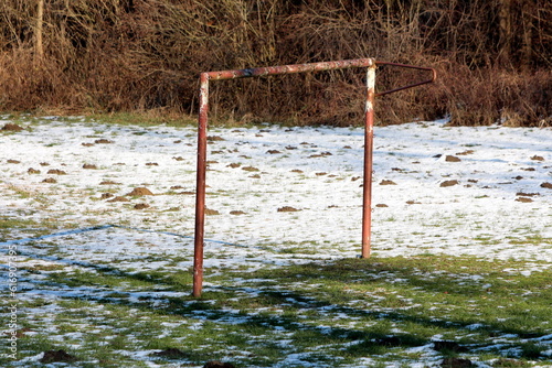 Fototapeta premium Rusted old goal post without net left on abandoned children playground covered with freshly fallen snow mixed with uncut grass filled with multiple molehills next to dense forest vegetation