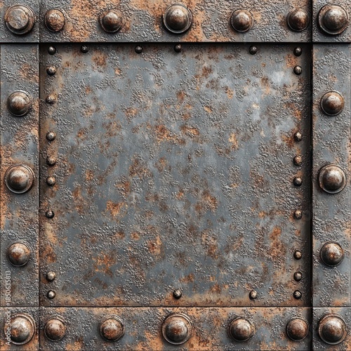 Fototapeta premium rusted riveted metal plate with corroded textured surface and bolted border conveying a rugged weathered industrial mood