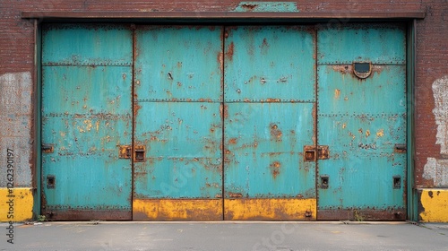 Naklejka premium Rusted teal warehouse doors, urban industrial background, closed, exterior use