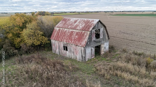 © Kitta Studio, Obraz premium Rustic Abandoned Barn Surrounded by Autumn Fields and Forests