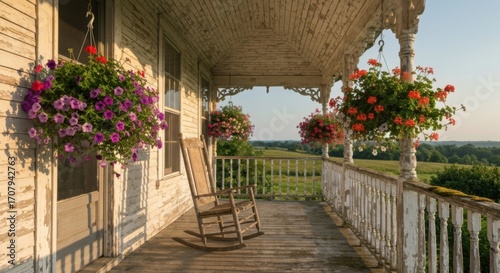 Naklejka premium Rustic Aesthetic Veranda with Blooming Flowers and Rocking Chairs