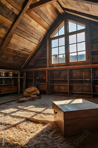 Naklejka premium Rustic Attic Charm: A sunlit attic room with wooden beams, shelves, and a...