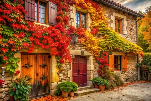 Naklejka premium Rustic Autumn Country House: Red & Green Vine Decorated Stone Wall Stock Photo