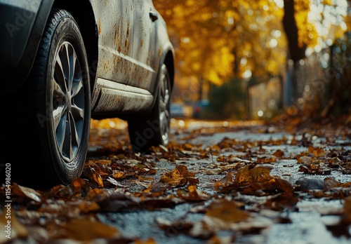 Fototapeta premium Rustic Autumn Scene with a Dirty Car Tire Amidst Colorful Fallen Leaves on a...