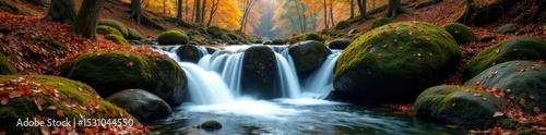 © Nattawadee, Obraz premium Rustic autumn waterfall cascading over moss-covered rocks , image, beauty