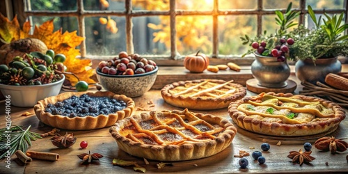 © Collection, Fototapeta premium Rustic Autumnal Still Life with Freshly Baked Pies and Warm, Golden Light Through the Window