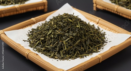 © luzaein, Fototapeta premium Rustic Bamboo Tray of Dried Green Tea Leaves Purity, Tradition, and Essence