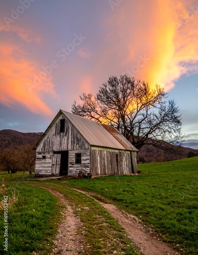 © Labuhan, Obraz premium Rustic barn at sunset, dramatic sky