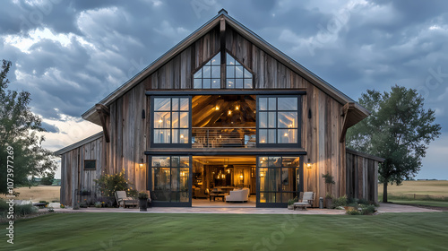 © Thiago, Fototapeta premium Rustic barn converted into a modern residence with large barn doors. Rustic. Illustration
