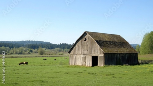 Obraz premium Rustic Barn in a Meadow with Cattle
