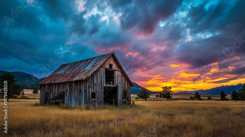 © Shahriar, Obraz premium Rustic Barn in a Summer Sunset Landscape .