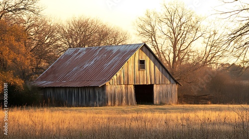 Obraz premium Rustic Barn in Golden Field at Sunset Peaceful Countryside Scene