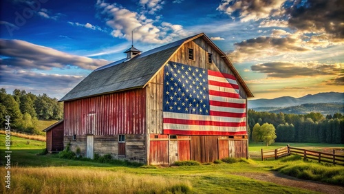 © Adisorn, Obraz premium rustic barn painted with the American flag, set in a peaceful countryside