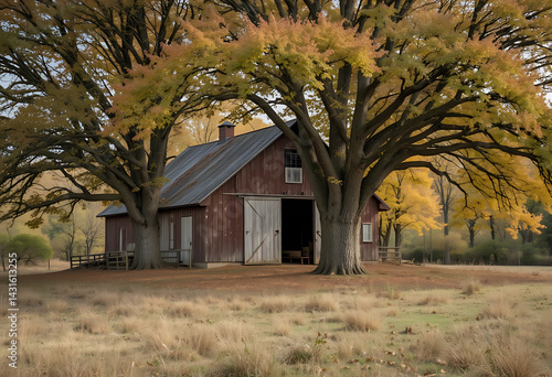 © skdesign, Obraz premium Rustic barn surrounded by vibrant autumn trees in a serene countryside setting