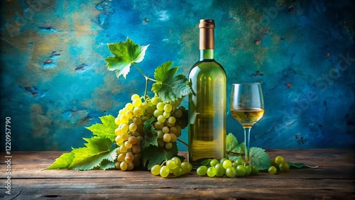 Fototapeta premium Rustic Blue Background Still Life: White Wine Bottle, Green Grapes & Leaves