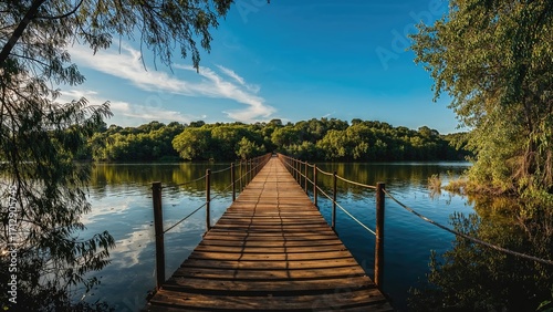 © AkuAku, Fototapeta premium Rustic boardwalks crossing a serene body of water surrounded by nature