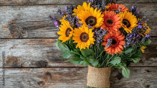 Fototapeta premium Rustic bouquet of sunflowers, gerbera daisies, and lavender on a wooden surface
