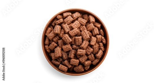 © vxnaghiyev, Fototapeta premium Rustic bowl filled with chocolate cereal pads against white background