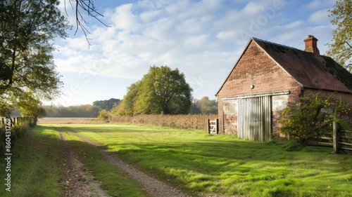 © Artyom, Obraz premium Rustic brick barn with open gate beside grassy path under clear sky