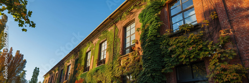 Naklejka premium Rustic Brick Office Building with Ivy-Covered Walls Against Golden Sky, New...