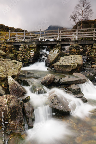 Naklejka premium Rustic bridge over a mountain cascade at Cwm Idwal in the Glyderau range of mountains in Snowdonia National Park North Wales