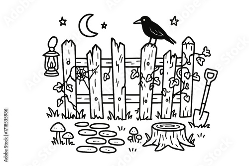 Naklejka premium Rustic Broken Fence. Old Fence. Hand-drawn doodle illustration old fence broken planks, cracks, vines, ivy, crow, spider web, mushrooms, shovel, stone path,