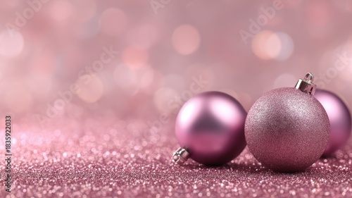 © Muhammad, Fototapeta premium Rustic brown and tan cowboy boots with matching western hat arranged beside shiny pink christmas ornaments on a glittering pink abstract background, festive winter holiday decor scene symbolizing the