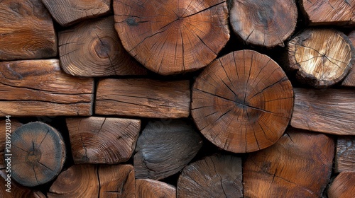 Naklejka premium Rustic Brown Wood Texture Cross Section Logs Timber Stacked Wood Wooden...