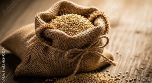 © ASMURI, Fototapeta premium Rustic burlap sack filled with wholesome grains displayed on weathered wooden surface emphasizing