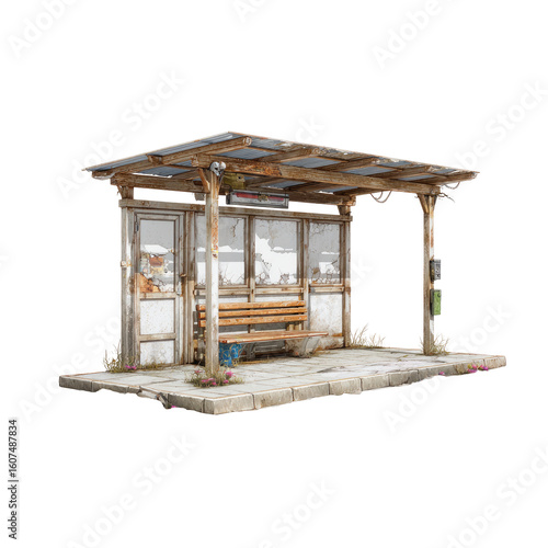 Obraz premium Rustic bus stop, weathered wood, empty bench
