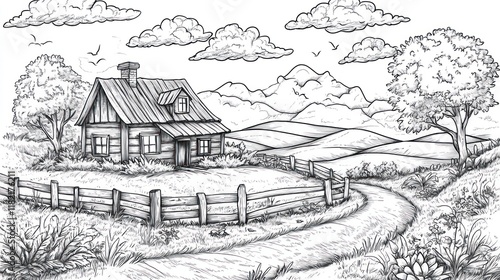 Fototapeta premium Rustic cabin, country road, rolling hills, coloring page, idyllic scene