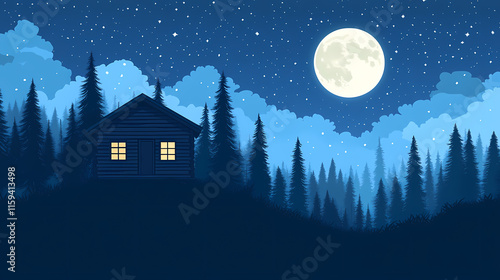 © Thiago, Fototapeta premium Rustic cabin in the woods with cloudy moonlit night sky. Moonlit. Illustration
