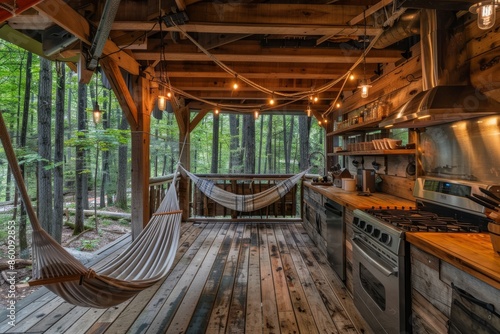 © Fitry, Fototapeta premium Rustic Cabin Kitchen with Hammock and Forest View