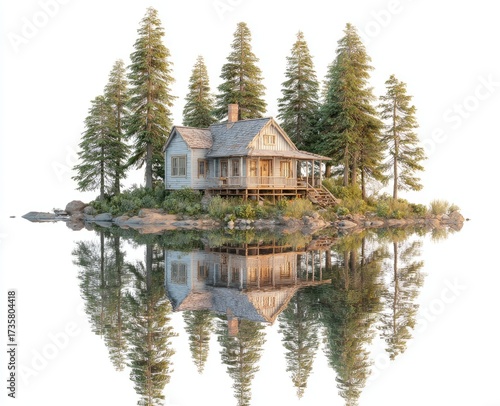 © James, Fototapeta premium Rustic cabin on a tranquil island reflected in a glassy lake