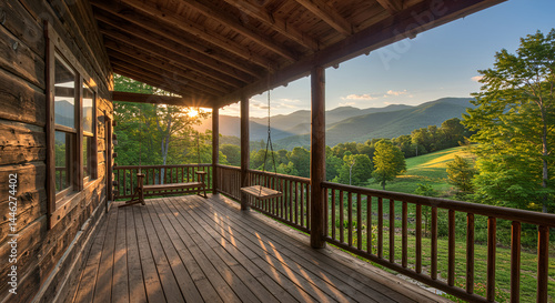 © Herlin, Fototapeta premium Rustic Cabin Porch Overlooking Scenic Mountain Range at Sunset